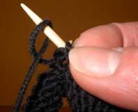 Rechts verschränkt zunehmen ist ganz einfach: einfach die erste Masche wie normal rechts stricken, aber die Masche nicht von der linken Nadel runterlassen. Noch eine Masche rechts könnte man aus dieser einen Masche ja nicht mehr stricken, also sticht man so in die Masche ein, als ob man die links stricken wollte. Aber weil der Faden hinter dem Strickstück ist, geht links nicht - ergo: einfach die Nadel wie zum Linksstricken einstechen und den Faden wie beim Rechtsstricken von hinten nach vorne holen. |