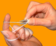 Faden legt man von vorne nach hinten um den linken Daumen, der zum